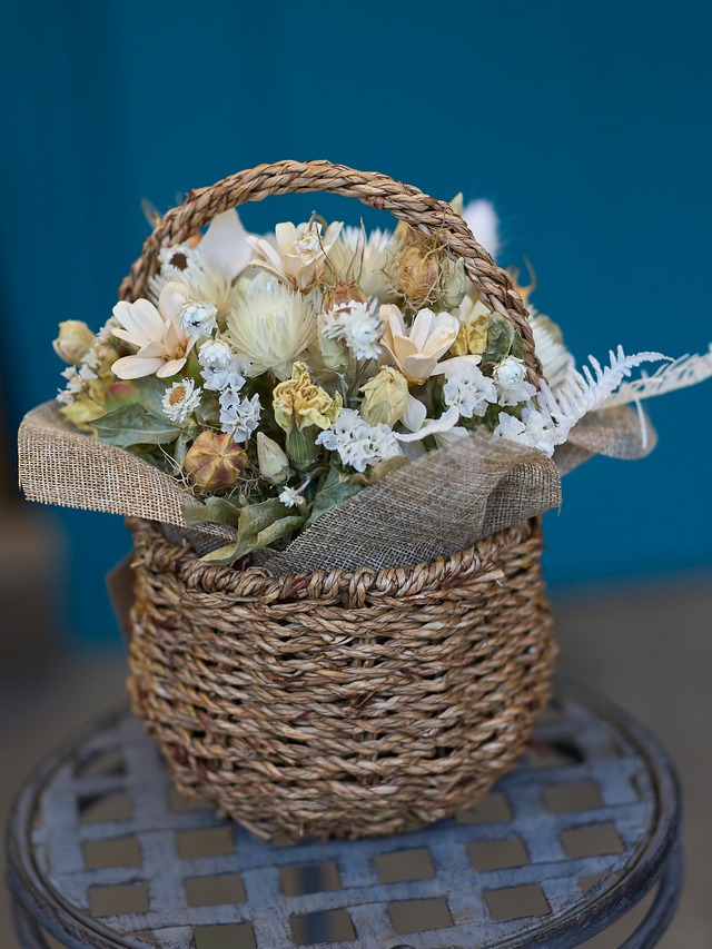 ドライフラワーかごアレンジSブルー ナチュラルなバスケットに、厳選したドライフラワーが詰め込まれたこのアレンジメントは、リビングや自宅のさまざまなスペースに彩りを添えてくれます。 季節ごとに移り変わる自然の美しさをそのまま楽しめるデザインで、長く愛用できるアイテムです。 1つ1つ心を込めて手作りしております。 ■使用花材 ・ ■カラー/サイズ/バリエーション ・カラー:ブルー(敷いてある紙をなくすこともできますのでご希望でしたらお問い合わせページよりお願いいたします) ・サイズ:横幅約13cm×高さ約17cm (宅急便配送サイズ60) ■お手入れ/取り扱い注意事項 ・水やりは不要ですが、直射日光を避けることで色合いを保つことができます。 ・湿気の多い場所を避けて飾ってください。 ■発送・注文に関する情報や注意事項 ・通常、発送はご注文から1日〜8日ほどお時間をいただいております。日時指定がある場合は配送画面にて設定をお願いいたします。 オーダーメイド品の場合、仕入れの状況により最短でのお届けが難しい場合はご相談させていただく場合がございます。 ・商品は壊れやすいため、丁寧に梱包いたします。 ■その他の情報や注意事項 ・手作りの商品なので、色や形に若干の個体差があります。 ・写真のイメージに合わせてお作りいたしますが仕入れ状況により花材が多少変わる場合がございます。 ・お問い合わせやご不明点は、ショップのお問い合わせページよりお気軽にご連絡ください。