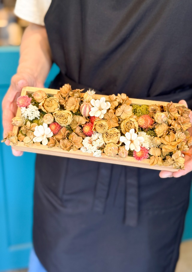 ドライフラワーボックス ナチュラル 穏やかな雰囲気を醸し出すこちらのドライフラワーボックスは、バラや千日紅を使用しており、ナチュラルな色合いが、どんな空間にも調和し、心を癒すインテリアとしてお楽しみいただけます。 ボックス内に広がるバラと千日紅の美しいコントラストは、まるで自然の中にいるかのような安らぎをもたらします。毎日の生活に、ひと匙の癒しを加える存在です。 1つ1つ心を込めて手作りしております。 ■使用花材 ・ミニバラ ・千日紅 ・プチフラワー ・ニゲラ ・アジサイ ■カラー/サイズ/バリエーション ・カラー:ナチュラル ・サイズ:横約26cm×高さ約10cm (宅急便配送サイズ60) ■お手入れ/取り扱い注意事項 ・水やりは不要ですが、直射日光を避けることで美しい色合いを保つことができます。 ・湿気の多い場所を避けて飾ってください。 ■発送・注文に関する情報や注意事項 ・通常、発送はご注文から1日〜8日ほどお時間をいただいております。日時指定がある場合は配送画面にて設定をお願いいたします。 ・オーダーメイド品の場合、仕入れの状況により最短でのお届けが難しい場合はご相談させていただく場合がございます。 ・商品は壊れやすいため、丁寧に梱包いたします。 ■その他の情報や注意事項 ・手作りの商品なので、色や形に若干の個体差があります。 ・写真のイメージに合わせてお作りいたしますが、仕入れ状況により花材が多少変わる場合がございます。 ・お問い合わせやご不明点は、ショップのお問い合わせページよりお気軽にご連絡ください。