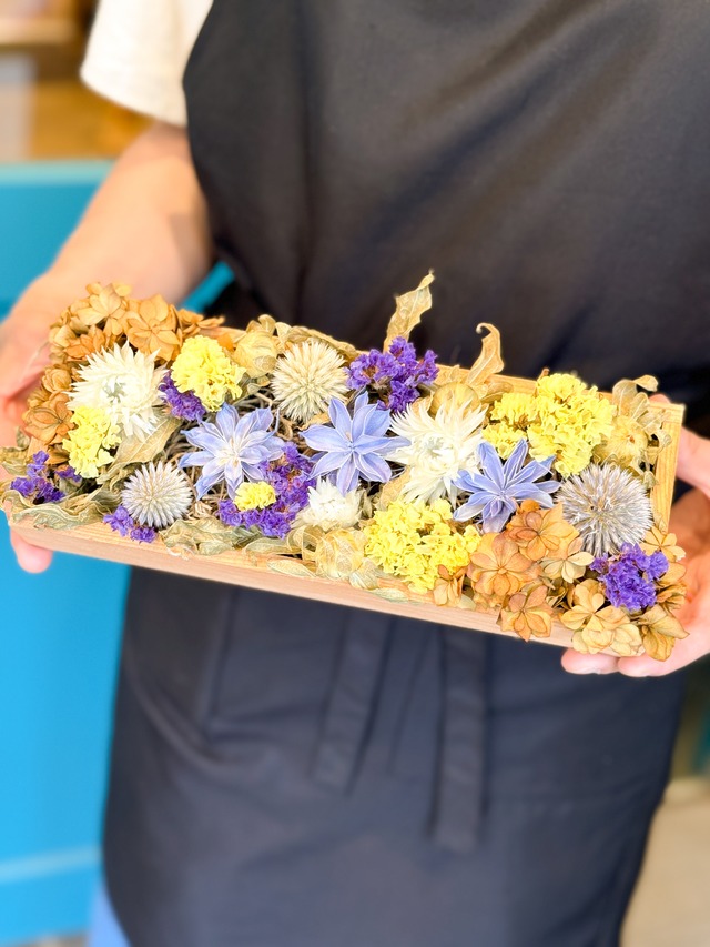 ドライフラワーボックス パープル 美しいスターチスを使用したこのドライフラワーボックスは、優雅で上品なパープルの色合いが魅力です。どんな空間にも馴染みやすく、心を和ませるインテリアとしてお楽しみいただけます。 ボックスの中に広がるスターチスの彩りは、まるで紫色の花畑を感じさせ、心に安らぎをもたらします。季節を問わず、毎日眺める度に新たな発見がありそうです。 1つ1つ心を込めて手作りしております。 ■使用花材 ・スターチス ・アジサイ ・ヒメゲッカビジン ・ルリタマアザミ ・シルバーデージー ■カラー/サイズ/バリエーション ・カラー:パープル ・サイズ:横約26cm×高さ約10cm (宅急便配送サイズ60) ■お手入れ/取り扱い注意事項 ・水やりは不要ですが、直射日光を避けることで美しい色合いを保つことができます。 ・湿気の多い場所を避けて飾ってください。 ■発送・注文に関する情報や注意事項 ・通常、発送はご注文から1日〜8日ほどお時間をいただいております。日時指定がある場合は配送画面にて設定をお願いいたします。 ・オーダーメイド品の場合、仕入れの状況により最短でのお届けが難しい場合はご相談させていただく場合がございます。 ・商品は壊れやすいため、丁寧に梱包いたします。 ■その他の情報や注意事項 ・手作りの商品なので、色や形に若干の個体差があります。 ・写真のイメージに合わせてお作りいたしますが、仕入れ状況により花材が多少変わる場合がございます。 ・お問い合わせやご不明点は、ショップのお問い合わせページよりお気軽にご連絡ください。