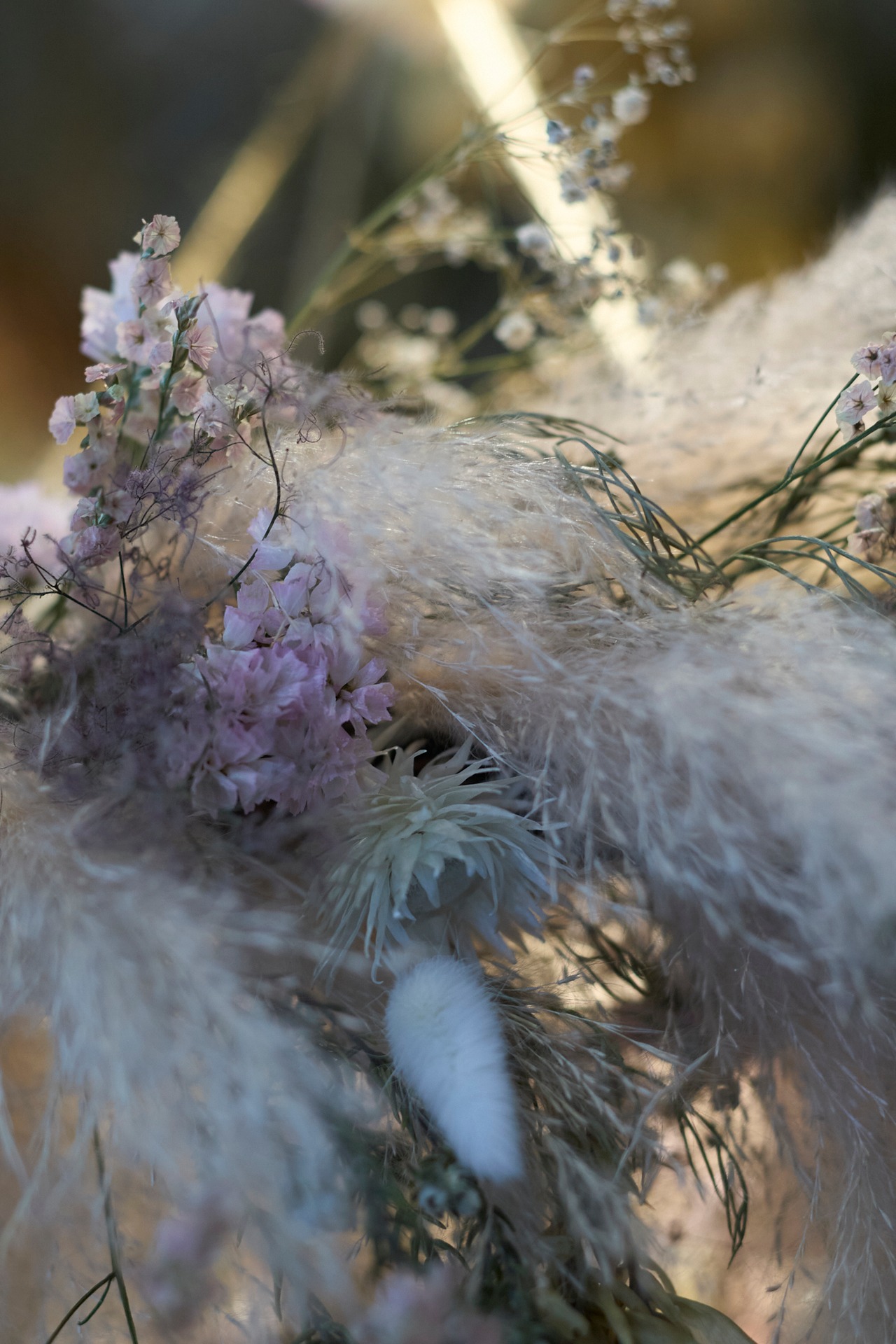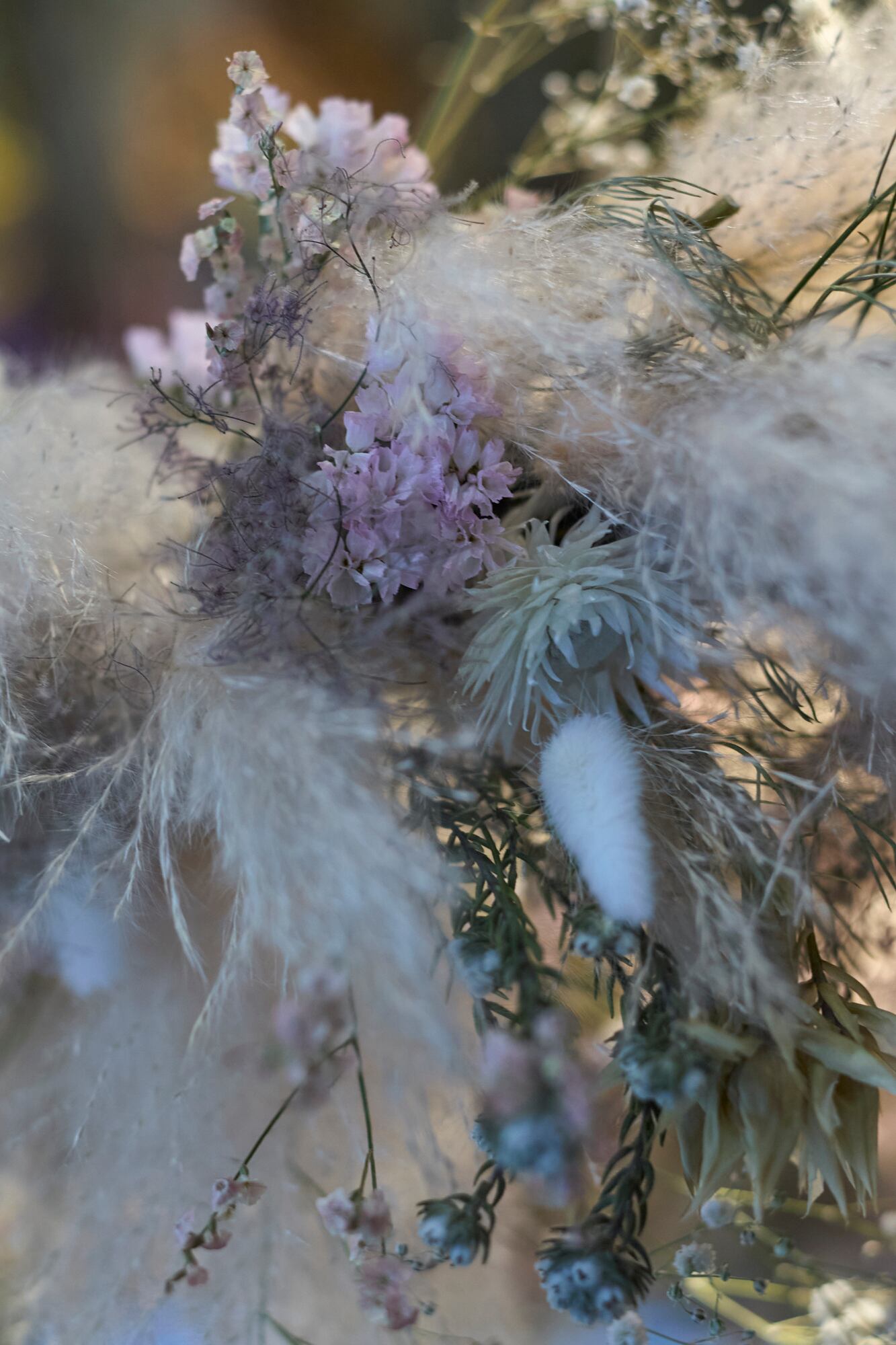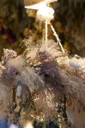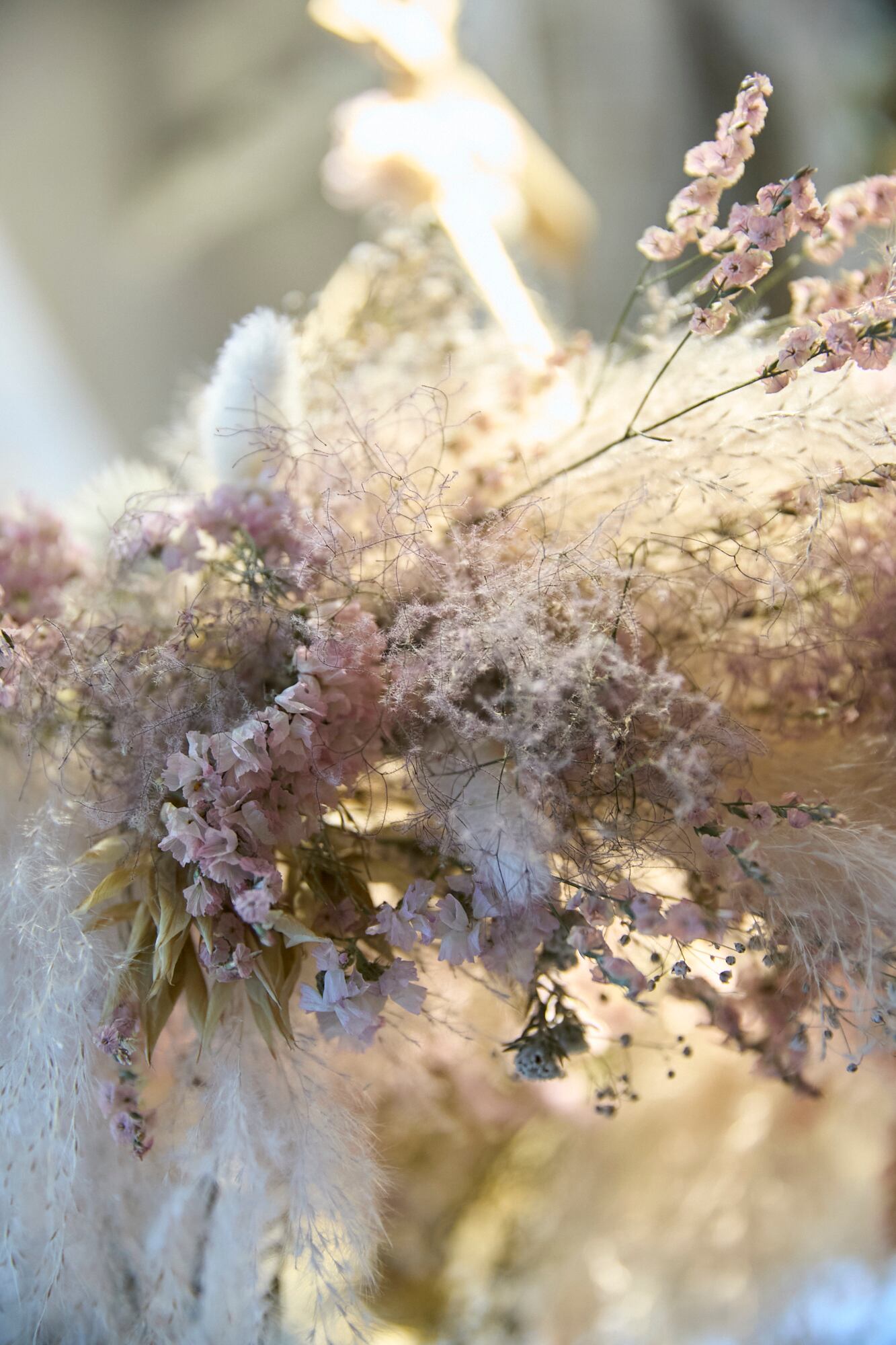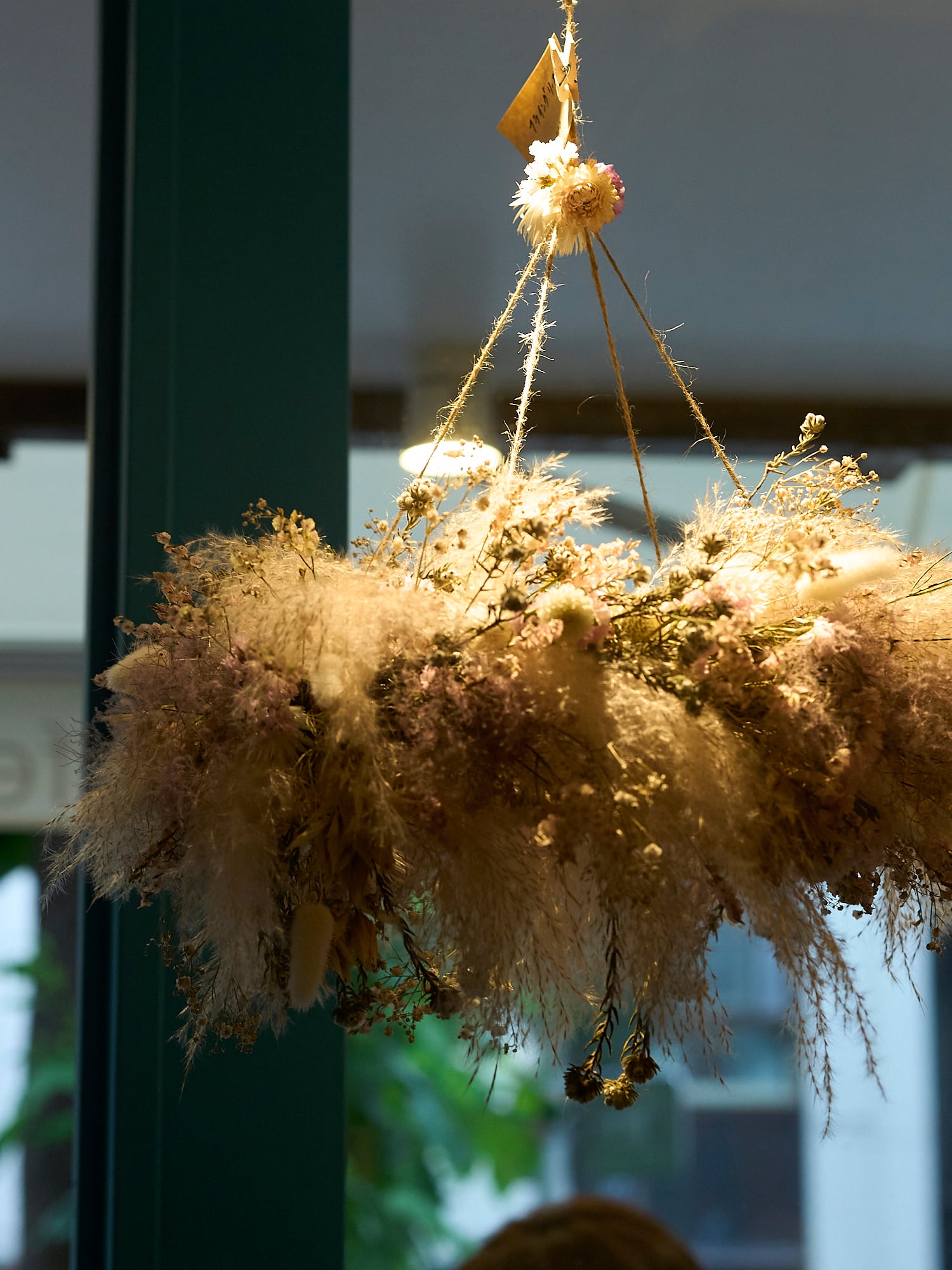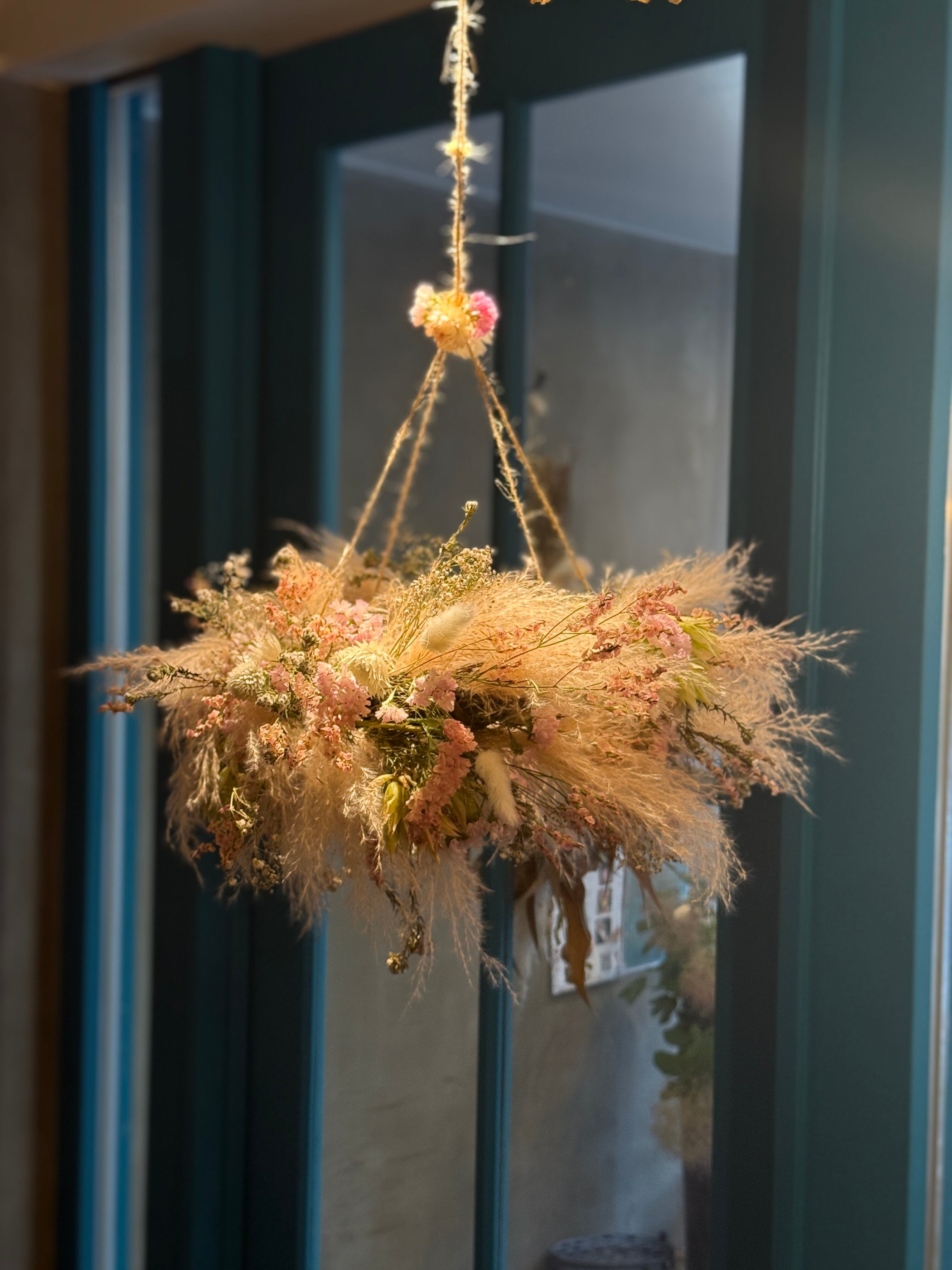 エレガントで優しい印象のこのフライングリースは、パンパスグラスを使用した特別なアイテムです。ピンクの柔らかな色合いが、心を和ませる空間を演出します。