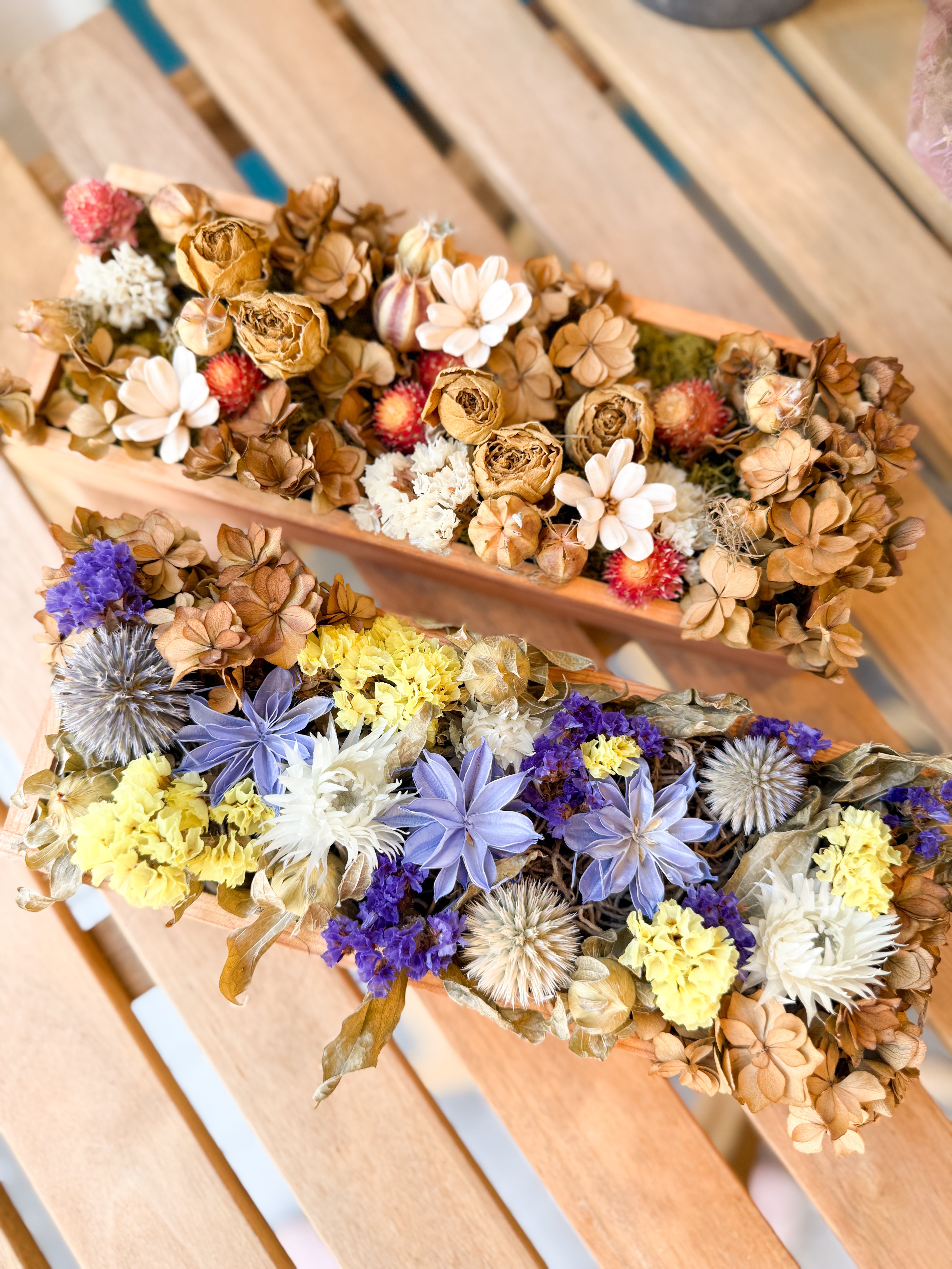 穏やかな雰囲気を醸し出すこちらのドライフラワーボックスは、バラや千日紅を使用しており、ナチュラルな色合いが、どんな空間にも調和し、心を癒すインテリアとしてお楽しみいただけます。